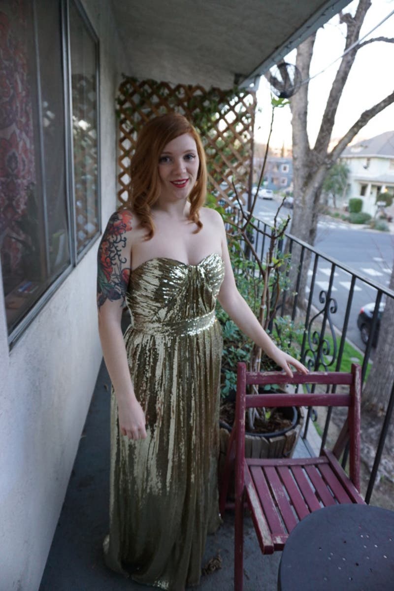 I LOVED wearing this dress. It's beautiful, flattering, and well-made, and glitters when you move. I felt like a movie star and got tons of compliments all night. As for the fit, my measurements are 38-29-39 and I was so happy with the fit of the 6P that I didn't even try on my backup size (8P). I'm 5'3" and was really glad that I went with the petite size - with 3 inch heels, it was just barely off the floor. There is no need to wear a bra or any kind of Spanx-style undergarments with this dress, since the material is thick and the dress is very flattering. I highly recommend this dress!