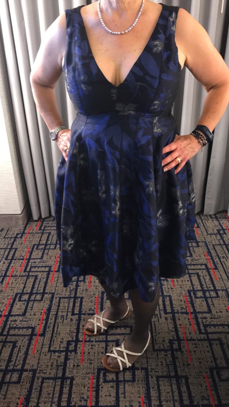 I am 155 pounds, 36D, 5'2" and normally wear size 12. This dress is fitted at the waist and the 5 pounds I gained after reserving the dress made the fit a little tight. Also, size up if you are busty. There was a lot of cleavage. I probably could have gone up to size 14. But the colors are beautiful and the material, while brocade-like, was not too heavy. As to a bra, I wore a standard bra and ended up pinning it so it would not show. I suggest a strapless one instead.