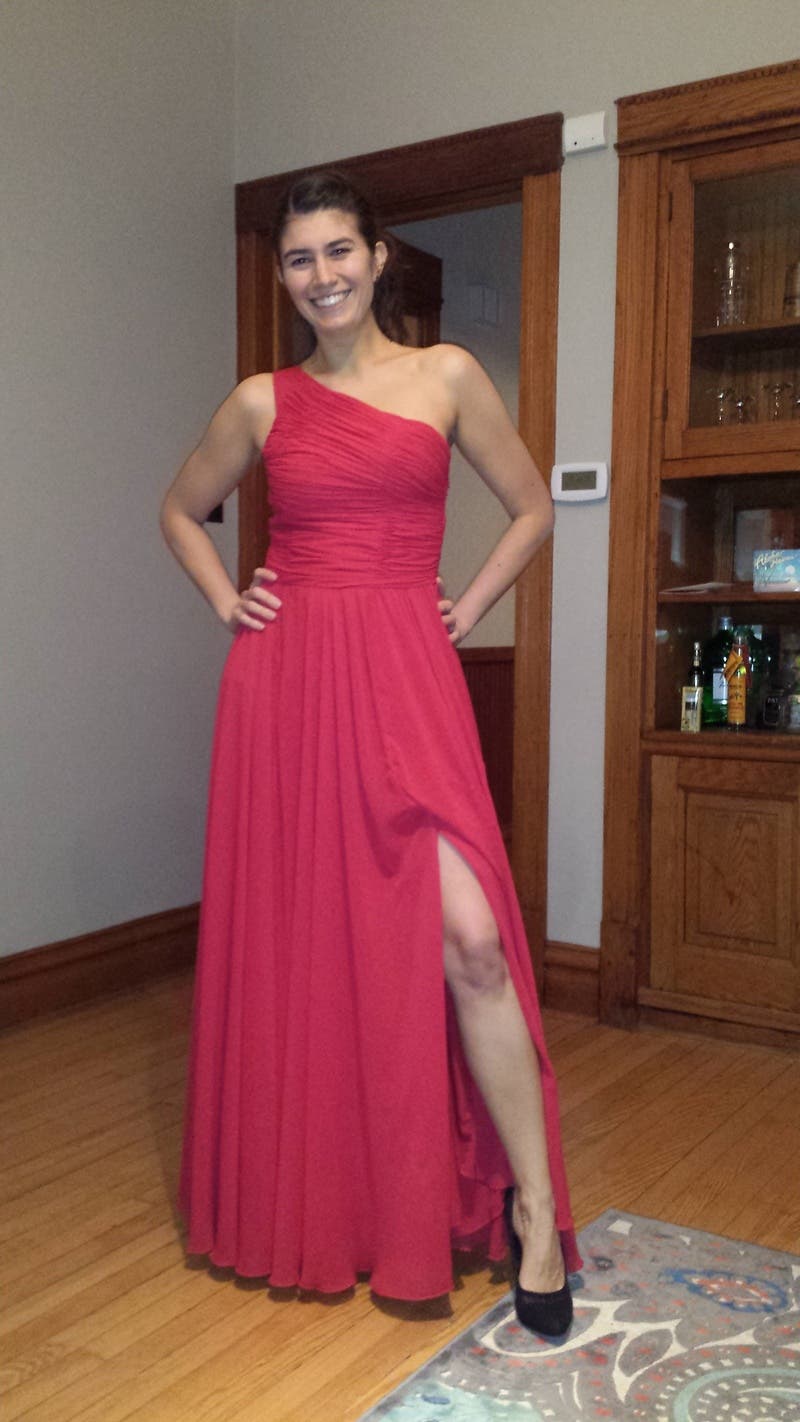 The dress is very comfortable, the fabric is very soft and doesn't itch. Having one strap definitely helps if you are big chested (you can hide a bra under it). The color was really amazing, and it flows very nicely. The length is perfect if you are wearing heels. Also, loved that I could fit my hips comfortably in it, which is sometimes an issue I encounter in dresses. It was my first rental, and I absolutely loved it!