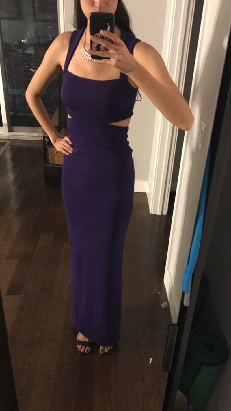 I wore this to a formal event and it was a fun alternative in a sea of black. It's classy yet modern with the cut outs on the side. The dress was a little tight for a 6. At 5'11 the long size was right above the ground in kitten heels.