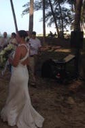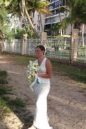 Beautiful dress, needed to use copious amounts of fashion tape to keep top of dress in position over bra-slip (d'Mondaine Rita). Length was very short on 6R and wore backup 8R because it was a little longer (otherwise fit was similar between 6R and 8R) - was barefoot or in flip-flops for photos and length was ok. Notice short train on dress. Wore heels for first dance and no problems with length of train. The material is creamy silk, and pairs well with gold and pearl. Be aware this dress needs to be steamed prior to wearing.