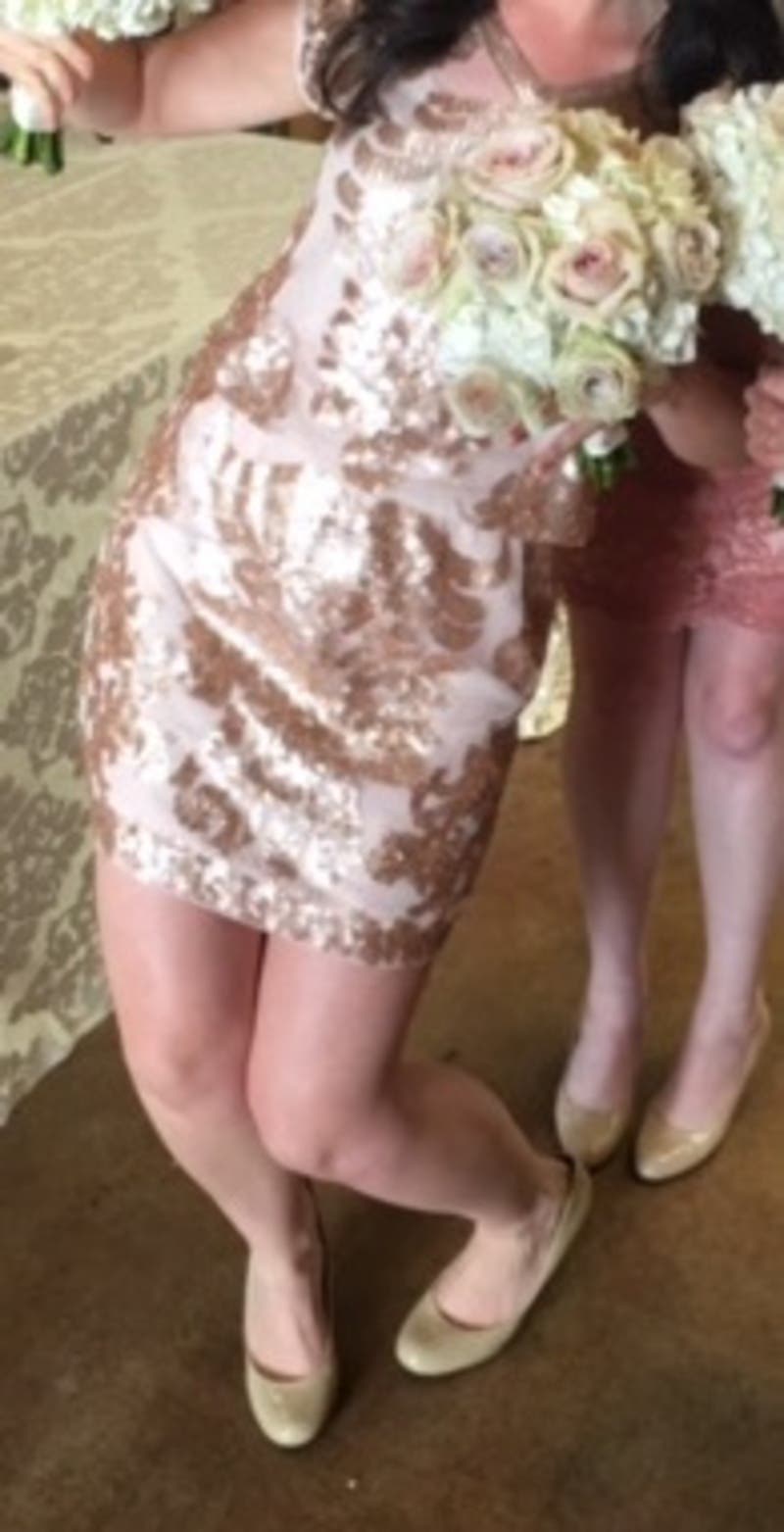 not the best pic bc we were being silly...but only full-length pic. I'm between a 4 and 6 and the 4 fit great; I have bigger hips and it didn't hang as loose as it does on the model, but I actually thought it gave it more shape. Rented this for a bridesmaids dress in a wedding; we all wore neutral tones and it fit in perfectly. Wasn't too sparkly at all, was just the right amount for an evening wedding. Dress wasn't too heavy or hot, easy to dance in. A great value, felt awesome in the dress.
