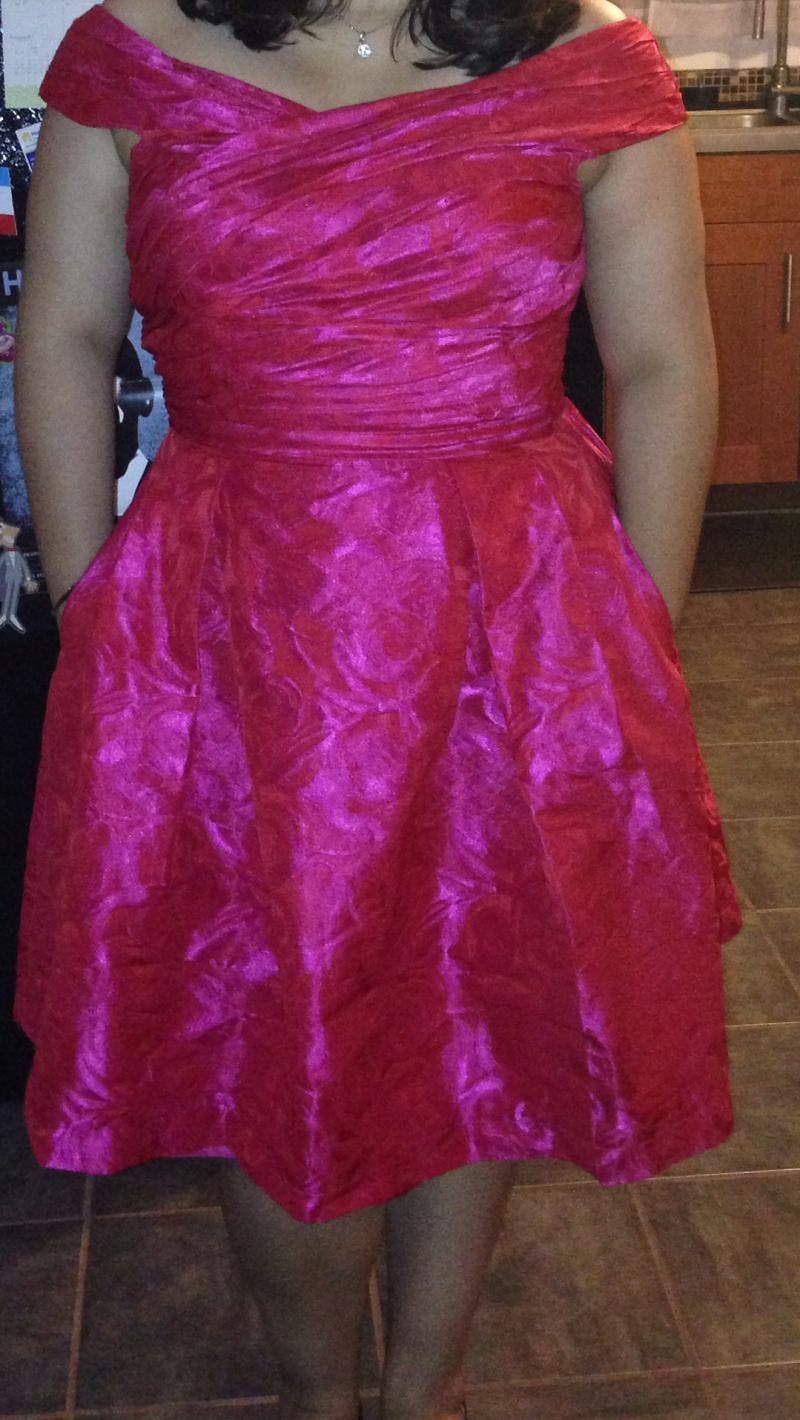 This dress has a beautiful pattern, with a bit of shimmer to it, and the fabric is very forgiving. It is fitted at the waist so make sure you get the right size for your upper body. I am an hourglass shape and my shoulders and ribcage can be bigger than a 12 depending on the designer. They didn't have a 12 available so I went for the 14 and it was just right. I had to get help to zip it on because the zipper goes all the way up past your bra strap and the zipper was kind of hard. But it was perfect! The pockets made this dress so easy and comfortable. And the off the shoulder style was very feminine. The only things that kind of bugged me were the straps to hang the dress. They kept popping out so tie them or tape them or something before putting it on because your arms will be restricted once the dress is zipped on and every time you move the will slip out and you'll have pictures showing them coming down your arms or your armpits. Awesome dress! Would wear it again but it's so memorable that I won't be able to repeat this one to another wedding for a while.