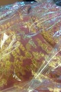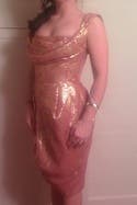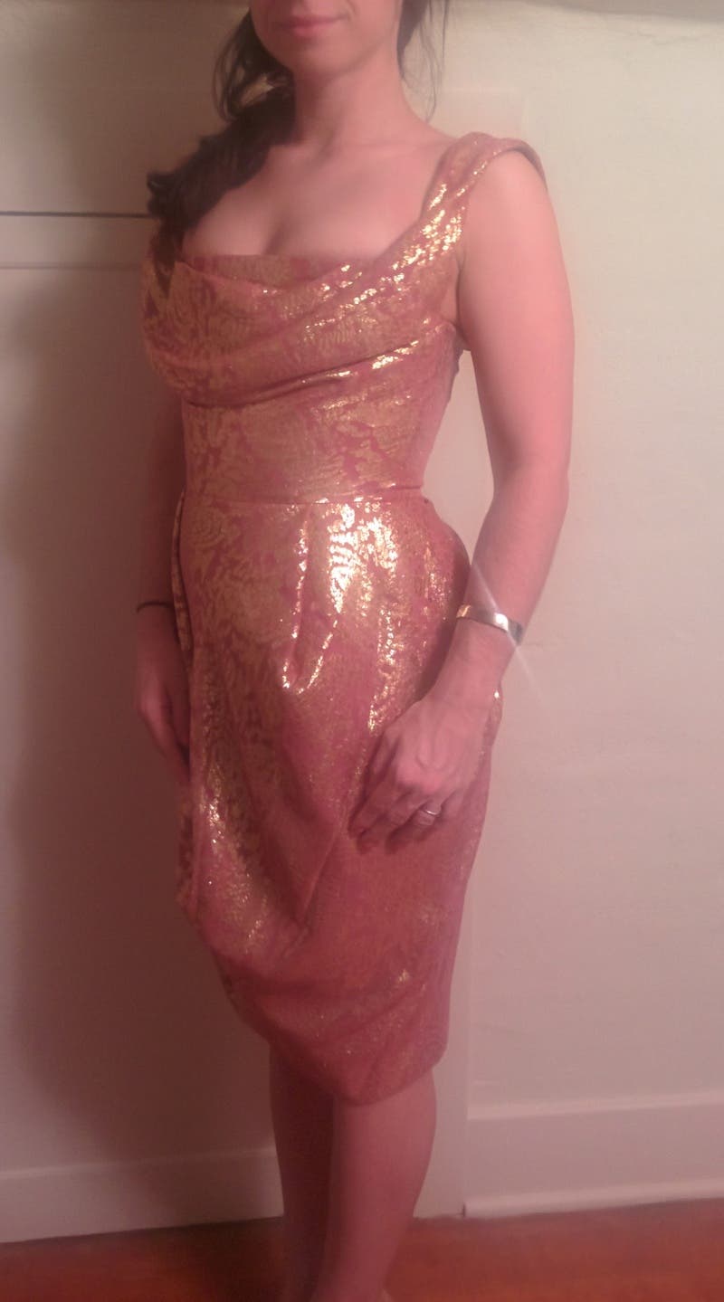 EDIT - received the larger size and it's absolute perfection. Fits everywhere and the foofy fabric 'round the bum looks artfully draped. I am so thrilled to wear this thing. Included is a picture under incandescent bulbs and one with a flash to give you an idea of how this will look in photos. Very shiny! I rented this as part of my unlimited membership for a future wedding, so I have time to exchange it for a larger size. If you are renting this for a normal rental I would def size up as your backup size. I can normally wear a 2 if its fitted to the waist, or a 4 to fit around my muscular thighs and bum. In this dress I ordered the 38, equivalent of a size 4. It slinked around my bum just perfectly and I was sold until I tried to zip is up around my small-to-average ribcage. SO TIGHT. It's not apparent from the photo but there is a full corset/bustier sewn into the lining of this remarkable dress. You will NOT need a bra with it. The bustier is a zip-up affair, and stretchy. I was able to zip that part up with help from hubs but the outer fabric was impossible. It doesn't have stretch, and I was afraid I would damage the dress if I tried hard to zip it up! It wasn't worth photographing since I couldn't even get it on! I'll post a photo when I get the larger size and can (hopefully) actually put it on. In the meantime here's a close up of the beeeeautiful fabric. :)