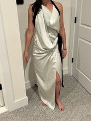 I would give this dress zero stars if I could. The slit was literally above my bum. I’m not sure how anyone can wear this piece. The fit was tts overall, just an insanely misplaced slit. Would have been stunning otherwise. Also, the color is more silver gray than white.