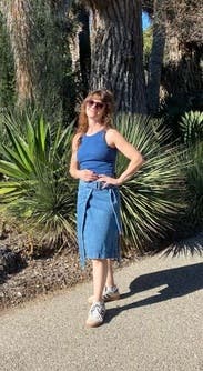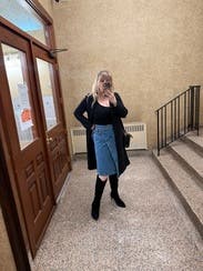 I absolutely loved this long denim skirt! The fabric is high-quality and comfortable to wear throughout the day. I appreciate the length—it's perfect for pairing with boots or sneakers, making it a great option for any season. I don’t like the way the belt hangs so I tucked it into the back of the waist. If you're looking for a stylish and comfortable denim piece, I highly recommend this one! Will rent again.