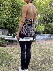 Fascinating combination of halter top and sweater. Needed a stylist to figure out how to put it on. Once on, it was a challenge to keep up, perhaps on account of my very flat chest - very difficult to wear any kind of bra. Paired with skinny jeans and sneakers for a truly casual affair.