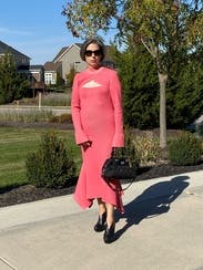 In pictures... IT IS STUNNING! Well made and very high-end BUT, so heavy. On petite frames (like mine), it hung to low, Had to keep pulling dress up. Also, not possible to wear a bra because of the cutout; that is fine for small chests (like mine) but I don't know how it would fit on larger chests. All-in-all, wearable for a dinner, comfortable since it is sweater-like BUT so heavy that it drags. Great for Insta photos though.