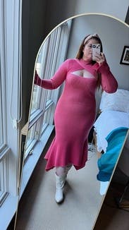I loved the weight of this and the details of the sleeves and skirt. Because of the weight, the cutout kept moving lower and exposing my bra. I tried to use tape, but that was impossible with the sweater material. A beautiful selection for a dinner date, but not with someone you can’t ask to let you know to adjust your dress. Continuously. This one is work.