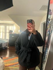 This jacket is much thicker than expected and too thick to be a wrap coat. There is no closure, so you are relying just on the belt to keep it closed. It adds so much bulk as weight. It fit large in the chest and body, but the top and front of the shoulders were oddly tight, making it difficult to lift my arms. It’s just a no all around…
