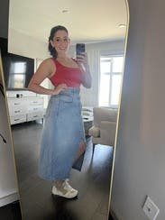 I wasn't ready to try denim skirts after being traumatized in my teenage years by them. However, this one is super cute and the double waistband makes it feel modern. I am considering buying as it wore it a few times while I had it rented.