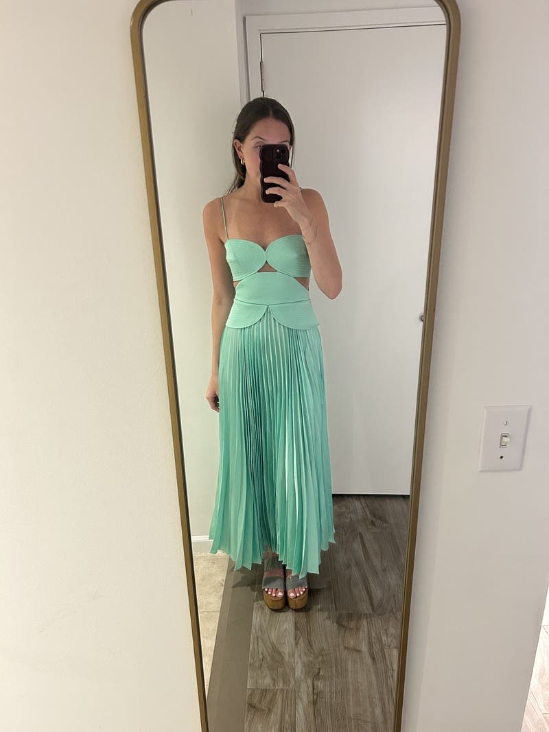 Green (100% Polyester). Cocktail Dress. Square Neck. Sleeveless. Back Zipper Closure. Shoulder to Hemline Length: 54". Imported.