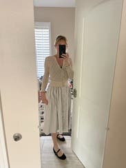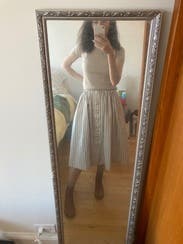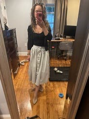 I didn’t end up wearing this one. The waist was much too small even on a larger size (like I didn’t even take a picture because it was too horrific and I think I damaged my internal organs trying to button it). Also, the fabric feels like flannel pajamas. Not what I would expect for a $1000 skirt.