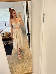 Waited to rent this for a while, when I finally did I didn’t find it as wearable as I thought. Material was heavy, waist of the size 10 I rented just fit me but wasn’t super comfortable. Would be cute as part of the set but wasn’t my favorite.