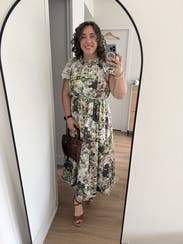 This dress has become a go-to. Fits so much more feminine and flattering than the cover photo shows, and so easy to dress up or down with heels or sneakers. The print on the dress felt like a watercolor work of art.