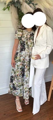I’ve had this on my list to rent forever, and I ended up totally loving it. The print is gorgeous - it looks rather abstract from a distance but is actually a collage of what seems to be printed photos of a huge variety of flowers. The fabric is plain light cotton poplin and is chic and easy to wear. The fit is true to size and the waist is fully elastic.