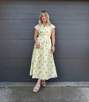 The Adam Lippes x RTR Belted Poplin Shirt Dress features a vibrant yellow floral print and a flattering fit-and-flare silhouette. Pair it with white sandals and a woven tote for a breezy, daytime look.