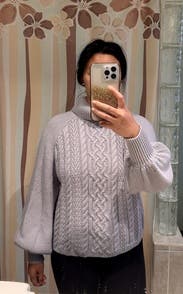 boxy, heavy, unique cableknit. Flared/drapey sleeves make it difficult to layer under a jacket. Lovely lavender color to brighten otherwise dreary winter