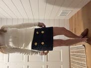 I received tons of compliments when I wore this skirt. Everyone focused on the gold buttons but I would say the best part is the cut/tailoring. I feel the buttons and the cut help obscure any belly pooch, making you feel more comfortable wearing a shorter top. Adding to my "All Time Faves" list at RTR.