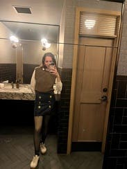 Super cute and unique denim skirt with the gold hardware, but definitely size up 1 size. I stayed true to size and it was a little too tight, but I wore it anyway because it was so cute!!