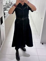 I can't resist a denim dress especially with pockets. Size 4 fit well - maybe slightly gaping? I didn't think it did but it looks like it might a little in some photos. Heavy thick denim, skirt is very full. Belt might be removable. Attracts all the lint and dog hair- I only tried it on for the photo and it's already covered. Be wary if you care about lint/dog hair!