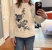 This Adam Lippes Collective sweater features a cozy knit texture with elegant floral embroidery, offering a sophisticated yet relaxed vibe. Pair it with a structured skirt or tailored pants for a refined ensemble.
