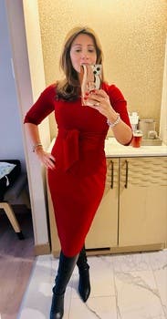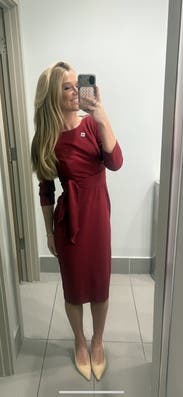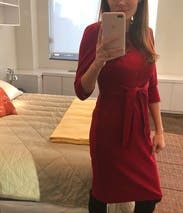 I wore this to work with tights and booties. It has a flattering cut but was definitely snug! I felt good wearing it to a client meeting and the office holiday party.