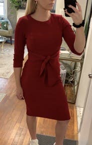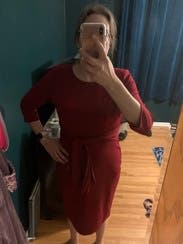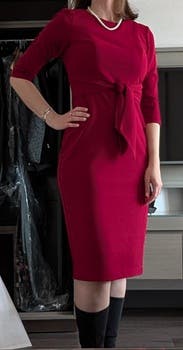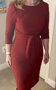 Perfect cool weather work dress! The tie in the front helps hide the tummy, just as I had hoped. It was just a little snug in the hips though.