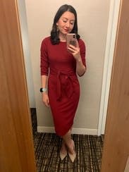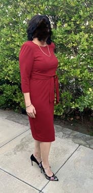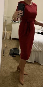 This dress is very flattering and perfect for work. I loved the color and the belt detail.
