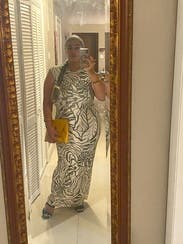 This dress is great for daytime or a casual dinner. Form-fitting without being uncomfortable, easy to pack if you’re traveling. I needed to wear a wedge sandal as the dress is long and I’m 5’9.