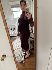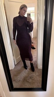 I wasn’t sure about this one when I first tried it on, but the fit surprised me in the best way. The mesh overlay is soft and stretchy, and the plum grid pattern gives it a really cool, modern vibe without feeling loud. It’s fitted but still comfortable, and the length feels elegant with ankle or tall boots. The high neck and long sleeves make it perfect for cooler evenings, and the fabric has just enough structure to feel flattering. True to size and stretchy.