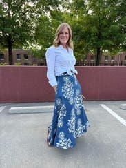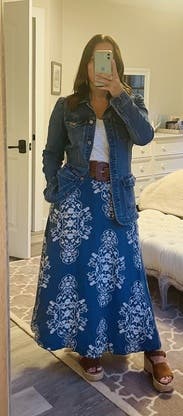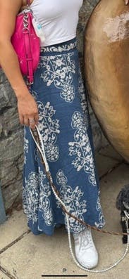 This skirt can be dressed up or down. The skirt is heavier than I expected. The waist is also small…somewhat disproportionate to the sizing. Still it’s a beautiful skirt.