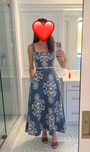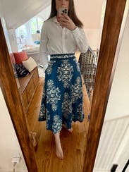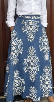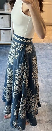 I received the skirt new with tags. I sized up to a small according to the designers website and I’m glad I did because the waist on the xs would been too tight. The color is a lighter blue than online and floral designs are beige not white. The skirt is very well-made, fully lined with pockets which was a nice surprise. At 5’4” the length is right above my ankles. It can be dressed up or down. If it wasn’t so expensive, I would keep it.