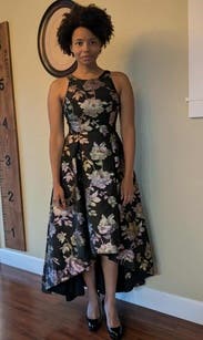 I wore this to my nonprofit's fundraising gala and I got the most amazing feedback. The holographic flowers really make this one stand out, and I had people telling me multiple times that they noticed me from across the room. I felt great in this and the pockets leveled it all the way up. The asymmetrical hem kept it from being stuffy. It's a little tight in the chest (I'm a 40DD) and I had to have help zipping it up. Other than that, no notes - you can't go wrong with with this one.