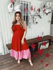 I sized up 1 size because I was 5 months pregnant when wearing this dress, otherwise I would say it runs TTS. I absolutely loved the red and pink colors, and didn't want to take it off at the end of the night! I'm always nervous about long or tea-length dresses given my height (5'1"), but this length was perfect (unfortunately, I don't have a full length pic). I highly recommend.