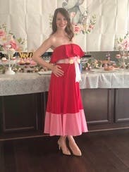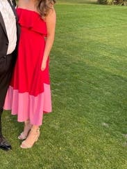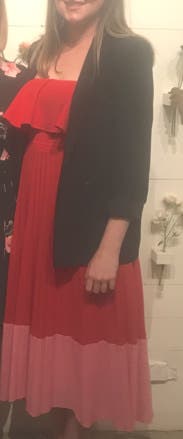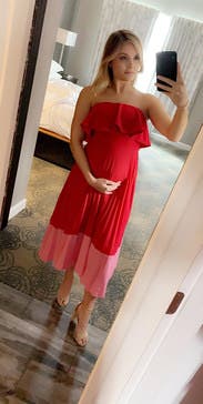 Rented this dress for a bat mitzvah and needed something that would be comfy and forgiving of an ever-growing 2nd trimester baby bump. My pre-baby size was a 6 or 8, but this pregnancy has tripled the size of my assets, so size 12 was the winner at this point to get it zipped up. This dress is so fun, flowy and super comfortable. I received compliments all night on the style and color - it really pops! Probably could have gone bra-less pre-pregnancy because of the ruffle over the chest, but did need a strapless bra. Love a dress that I don't have to hike up all night and this one stayed where it was supposed to. I'd definitely rent this again and highly recommend to other mamas to be. (This is not a maternity dress, but is a great option for a bump)
