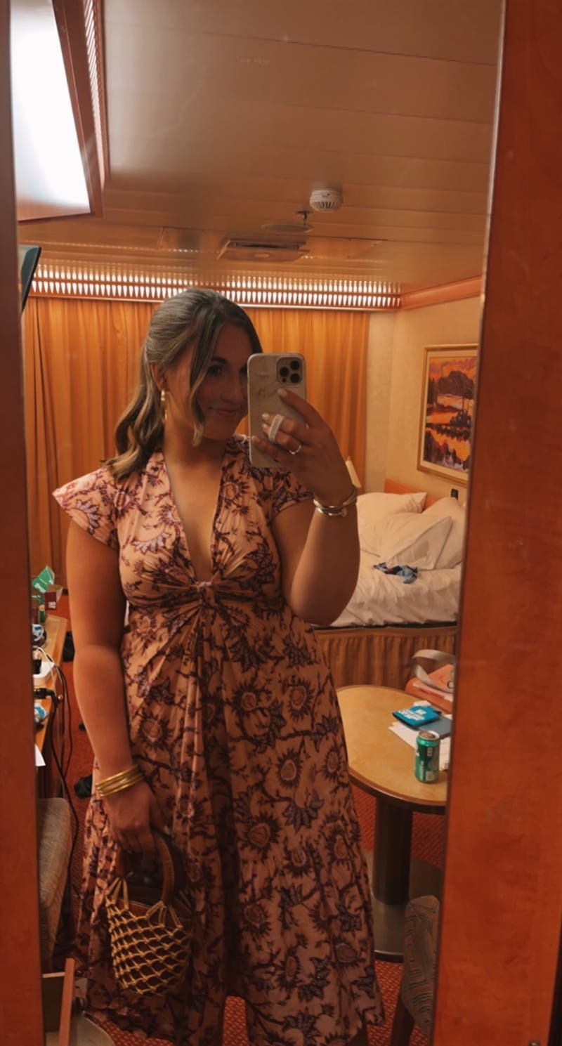 Pink printed cotton (100% Cotton). Dress. Cap sleeves. V-neckline. Invisible back zipper with hook-and-eye closure. 50" from shoulder to hemline. Imported.