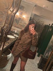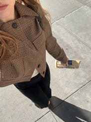 I wore this lightweight jacket while walking around London. It’s the perfect weight for a 60-70 degree day. I paired it with a sleeveless mocked black sweater. It is the perfect amount of cropped. I liked the boxer fit and would definitely rent again. I would have bought it if it weren’t so expensive. Such a great staple piece that is classic.