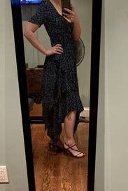This is one of my favorite dresses I've rented! It can be casual or dresses up so easily. The cut along the bottom is so unusual but super flattering. It was perfect for a chilly spring day.. I wore it to a daytime graduation with low booties. It's very comfortable, but I would say the bust is small. I'm small breasted and was fine just not wearing a bra, but I'd say if you're bigger than a C cup either size up or this might not work for you at all. No stretch really. Loved the color pattern and crimping along the botttom.