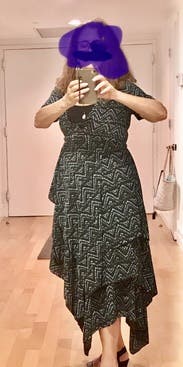Stunning fabric and the movement and swish were delicious. Took one star off bc it's extremely low cut and a camisole was a must. I took this on a tropical vacation so wearing the cami made it hot so I didn't feel as breezy as I wanted to. Loved the layers. They probably made it less slimming but I didn't care!