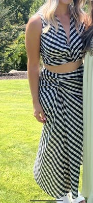Absolutely love this top! The material is perfect for vacation, light, comfortable, and really flattering. The neckline and length are great, and it pairs perfectly with white shorts. I rented the matching skirt but ended up not wearing it. There’s a small button/snap to keep the neckline closed, but it wouldn’t stay for me (larger chest), though it wasn’t noticeable at all. I loved it so much I actually considered not returning it!