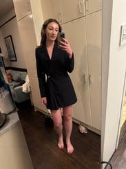 Loved this blazer dress by ALC! It’s the perfect mix of professional and chic, with just the right amount of edge. The blazer dress fit like a dream—tailored in all the right places without feeling too tight. The pleated detail added a fun, feminine touch to an otherwise structured look, making it ideal for a work meeting or a polished night out. The material felt high-quality, and the length was perfect for pairing with tights and heels. Fit & Sizing: True to size. I went with my usual size, and it fit perfectly. The blazer style gives a bit of room in the shoulders and the waist, so it’s comfortable to wear all day. I will say, you definitely need a shirt underneath. I wore a button down to make it more meeting appropriate. Styling: I styled it with navy tights and heels for a polished, work-appropriate look, but you could easily dress it down with ankle boots or even sneakers for a more casual vibe. Overall: Highly recommend for anyone looking to elevate their meeting wardrobe while staying comfortable. Would rent again!