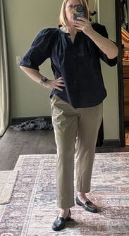 I normally wear more fitted tops so this is out of my zone. The long cuffs give the puff sleeves more shape and the crisp fabric and neutral color allow the styling to shine. I’ll try it with a few more things because I like the styling but it’s a lot of blouse—I haven’t decided if that’s a plus or minus yet