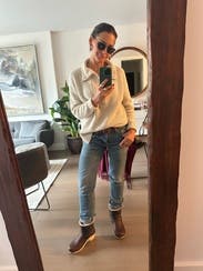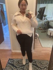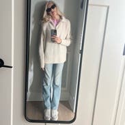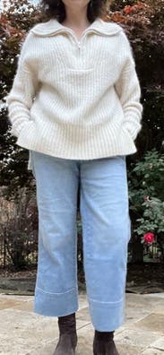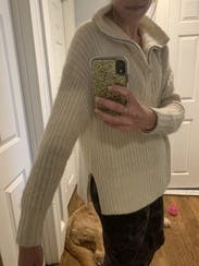 I was surprised by how much l liked this given the not so great reviews. It was so soft and cozy. Great to wear with leggings but polished look on top for WFH. Perfect oversized fit but not too large.