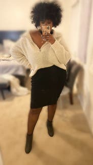 Unfortunately did not work out for me. Way shorter than I expected based on pictures and when you add in the side slit, it was just awkward and unflattering at this length. Loved the ivory color and it was super soft and warm.