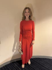 This is a beautiful dress with a true bright red worn to an Olympic Event