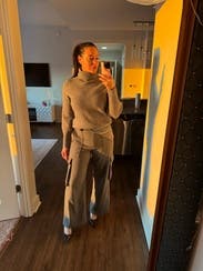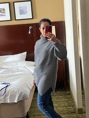 Surprisingly got so many compliments. Worn once over black yoga pants with chunky boots, and another time with pinstripe slacks for work. The back cutout is a great touch. Flattering, forgiving, and cozy