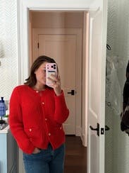 Some sweaters/cardigans can be scratchy and uncomfortable but not this one. It’s the perfect weight for the office or being at home without getting too hot or cold. The color is fun and bright without being overwhelming. I got so many compliments on this sweater and will be wearing it again.