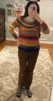 I loved the pattern and bright colors in this sweater. It was warm on a cold day. The fit was little boxy though. Could have been more flattering if it was a bit more fitted.