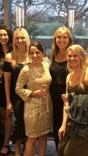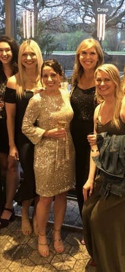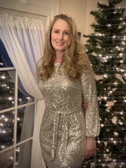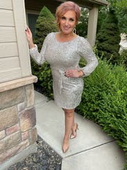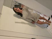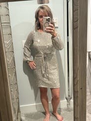 Silver sequins (90% Polyester, 10% Spandex). Hourglass. Boat neckline. Three-quarter sleeves. Back button closure. 35.5" from shoulder to hemline. Imported.